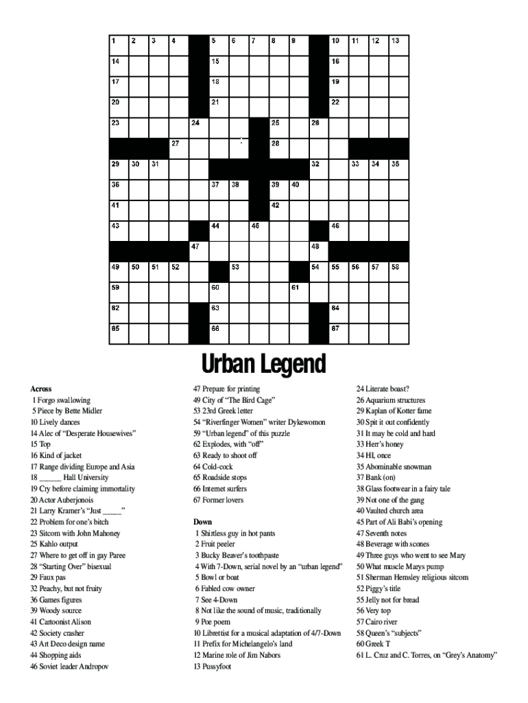 Urban Legend Across 1 Forgo swallowing 5 Piece by Bette Midler 10 Lively dances 14 Alec of Desperate Housewives 15 Top 16 Kind of jacket 17 Range dividing Europe and Asia 18 ___ Hall University 19