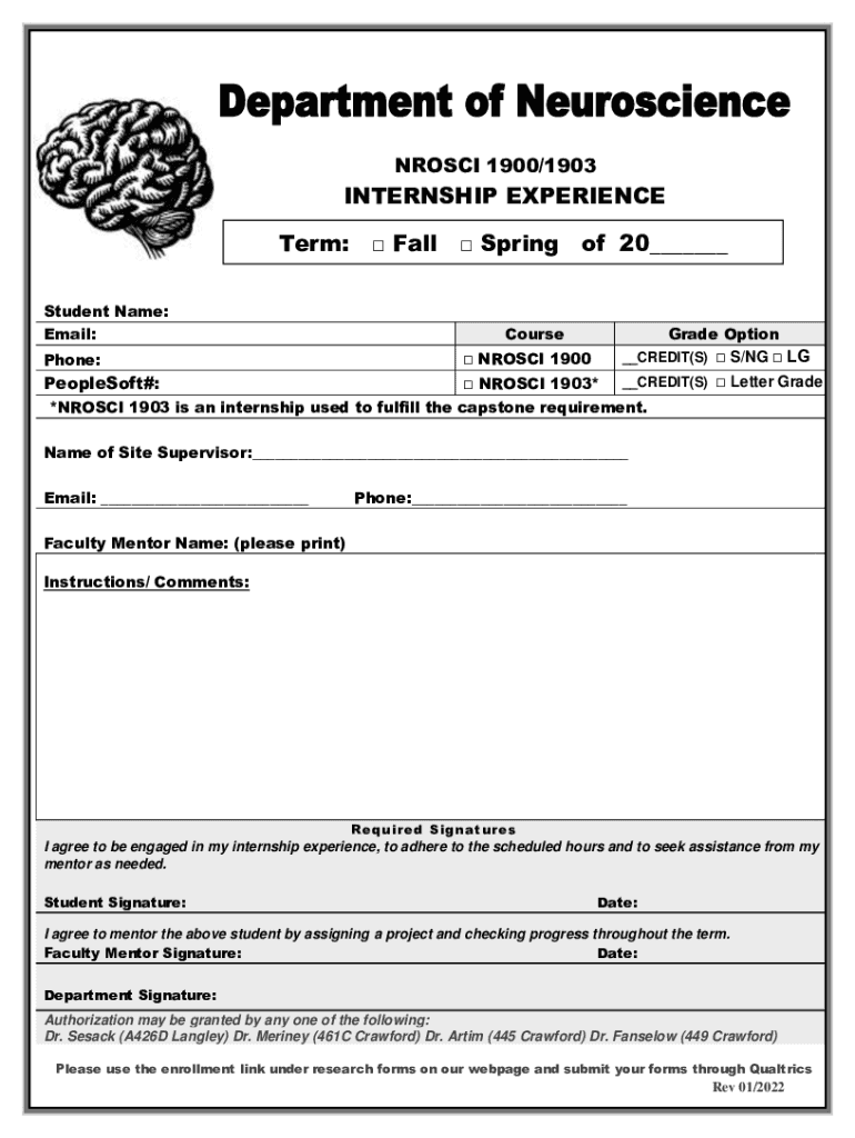 NROSCI 1900/1903INTERNSHIP EXPERIENCE Term: Student Name: Email: Phone:PeopleSoft#: Fall Springof 20___Course NROSCI 1900 NROSCI 1903*Grade Option S/NG LG__CREDIT(S)__CREDIT(S) Letter Grade*NROSCI