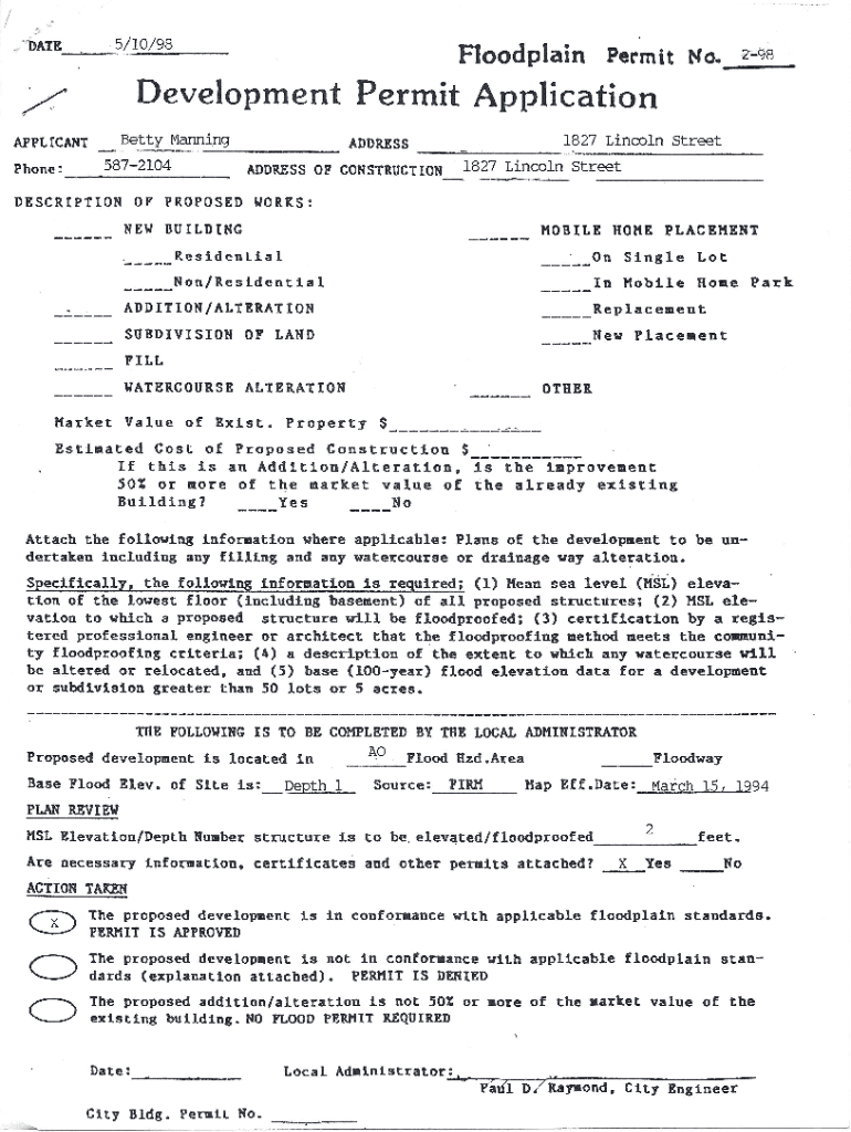I diATE.__5,/1_0...;.../_9_8 _FloodplainPermit ApplicationDevelopment APPLICANTBetty Manni,ng.5872104Phone:DESCRIPTIONOFPROPOSEDNEWBUILDINGPermit No. ADDRESS OF CONSTRUCTION1827 LincolnStreetWORKS: