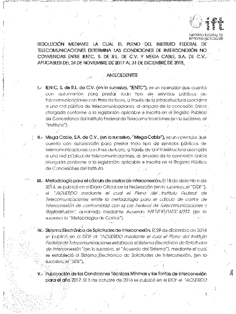 / /t/NSTITUTO FEDERAL DE TELECOMCAClONE\'S/RESOLUCIN MEDIANTE LA CUAL EL PLENO pEL INSTITUTO FEDERAL D TELECOMUNICACIONES DETERMINA LAS CONDICIONES DE INTERCONEXIN NO CONVENIDAS ENTRE IENTC, s. DE