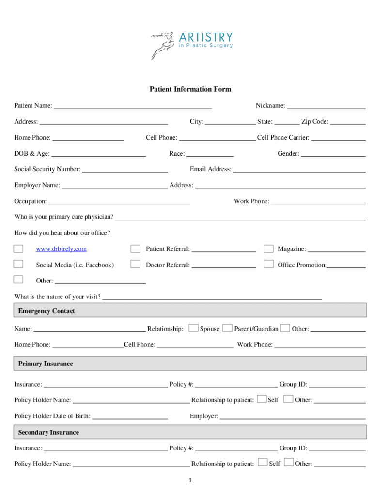 Patient Information Form Patient Name:Nickname:Address: Home Phone:City:State:Cell Phone:DOB & Age:Cell Phone Carrier:Race:Social Security Number:Zip Code:Gender: Email Address:Employer Name:Address:Occupation:Work