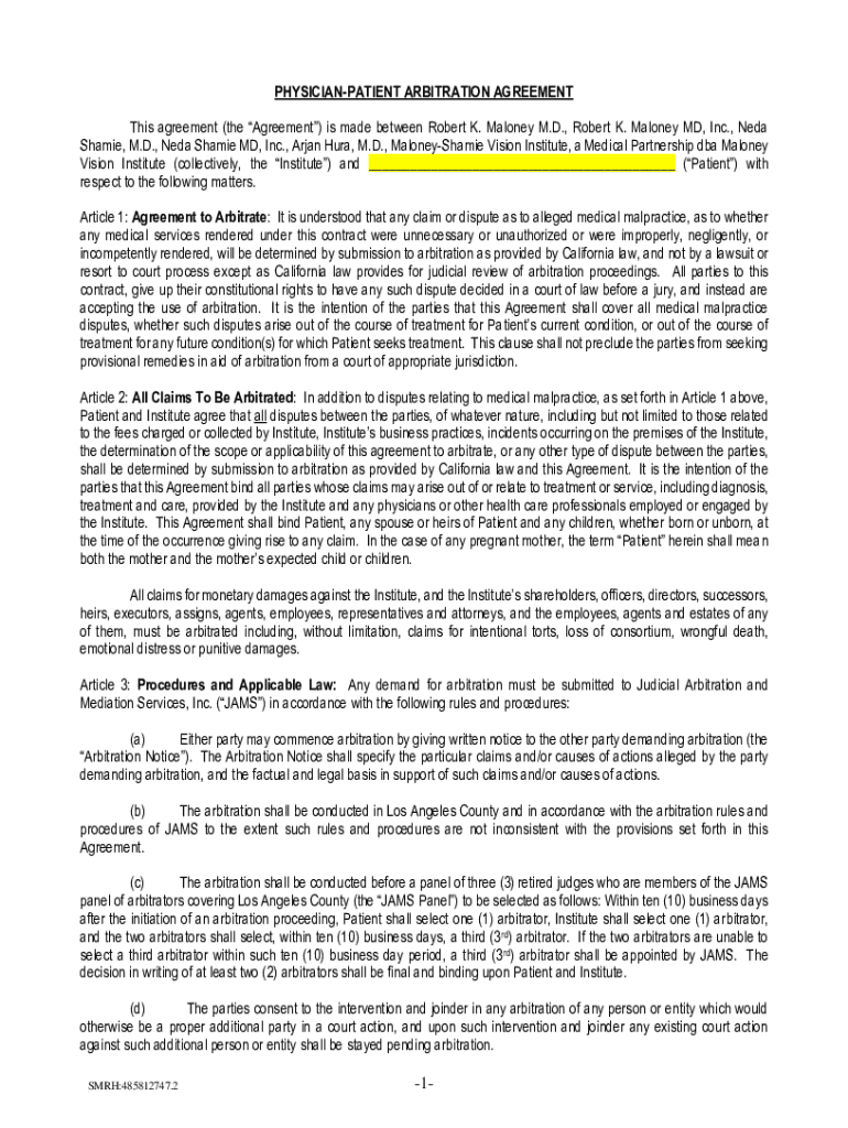 PHYSICIANPATIENT ARBITRATION AGREEMENT This agreement (the Agreement) is made between Robert K. Maloney M.D., Robert K. Maloney MD, Inc., Neda Shamie, M.D., Neda Shamie MD, Inc., Arjan Hura, M.D.,