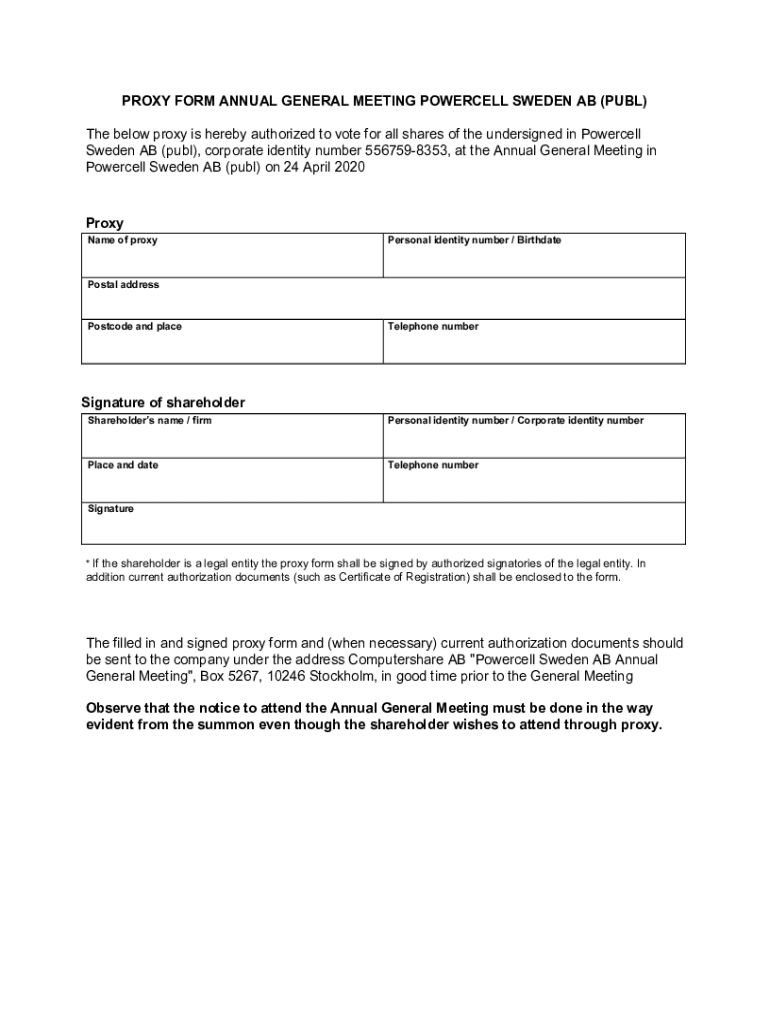 PROXY FORM ANNUAL GENERAL MEETING POWERCELL SWEDEN AB (PUBL) The below proxy is hereby authorized to vote for all shares of the undersigned in Powercell Sweden AB (publ), corporate identity number