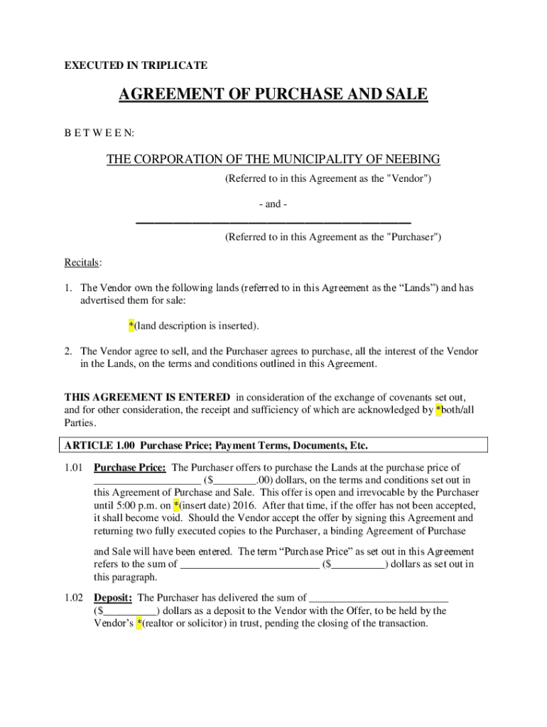 EXECUTED IN TRIPLICATEAGREEMENT OF PURCHASE AND SALE B E T W E E N:THE CORPORATION OF THE MUNICIPALITY OF NEEBING (Referred to in this Agreement as the \"Vendor\") and ___ (Referred to in this Agreement