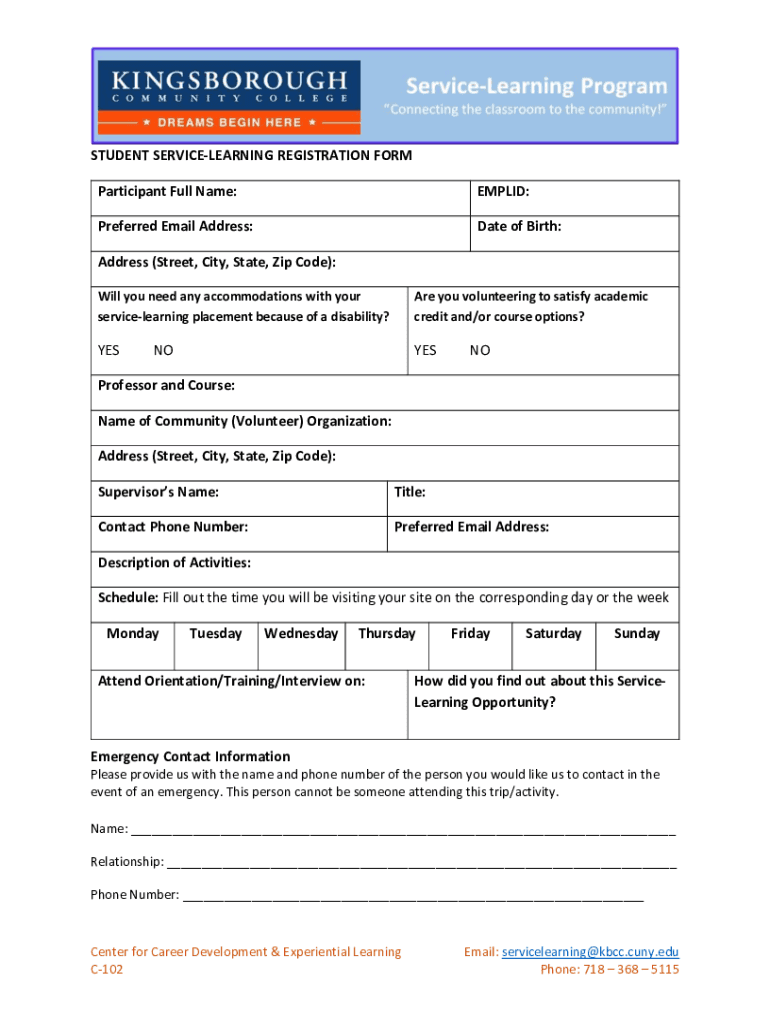 STUDENT SERVICELEARNING REGISTRATION FORM Participant Full Name:EMPLID:Preferred Email Address:Date of Birth:Address (Street, City, State, Zip Code): Will you need any accommodations with your servicelearning