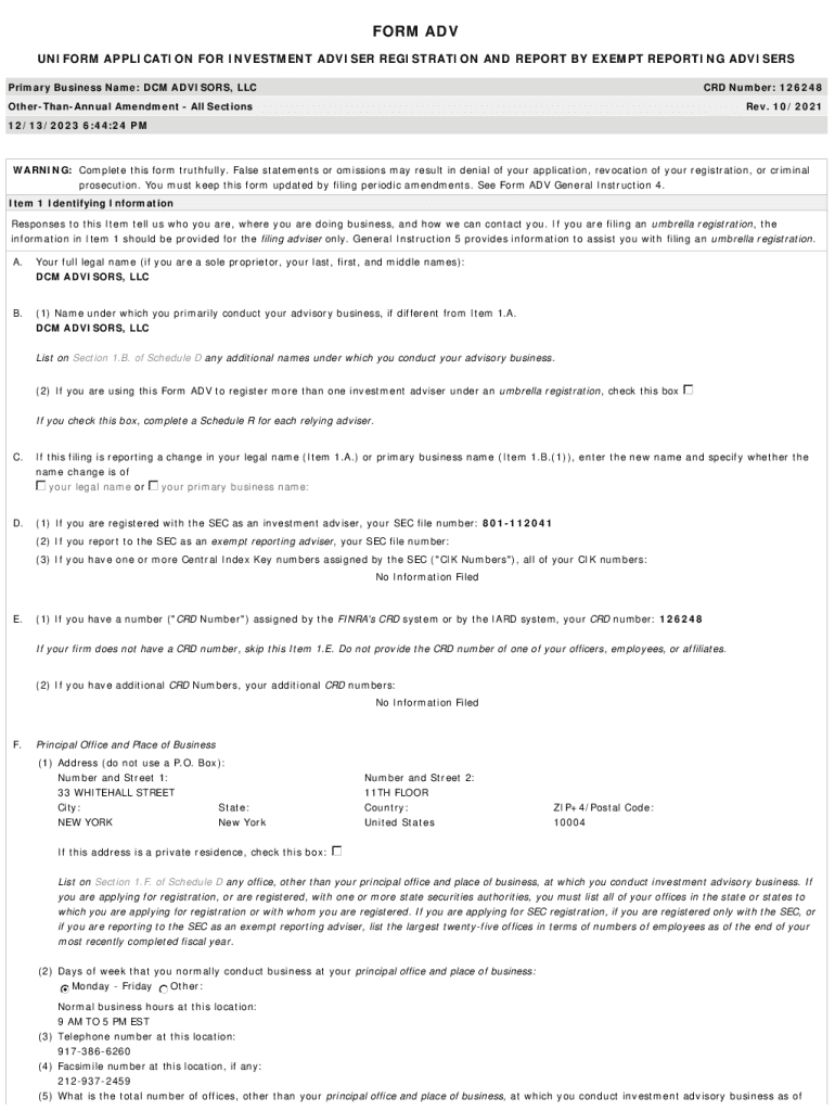 FORM ADV UNIFORM APPLICATION FOR INVESTMENT ADVISER REGISTRATION AND REPORT BY EXEMPT REPORTING ADVISERS Primary Business Name: DCM ADVISORS, LLCCRD Number: 126248OtherThanAnnual Amendment All SectionsRev.