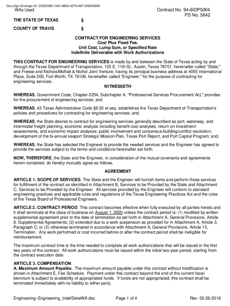 DocuSign Envelope ID: CD220386134C4B54A270A2F1DE2AD080 0676A6F7693D4599842DCA7EF8000E42Contract No. 946IDP5004 PS No. 5842WAs Used THE STATE OF TEXASCOUNTY OF TRAVIS CONTRACT FOR ENGINEERING SERVICES