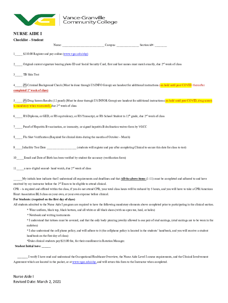 NURSE AIDE IChecklist StudentName: ___ Campus: ___ Section id#: ___1___ $210.00 Register and pay online (www.vgcc.edu/ohp) 2___ Original current signature bearing photo ID and Social Security Card,