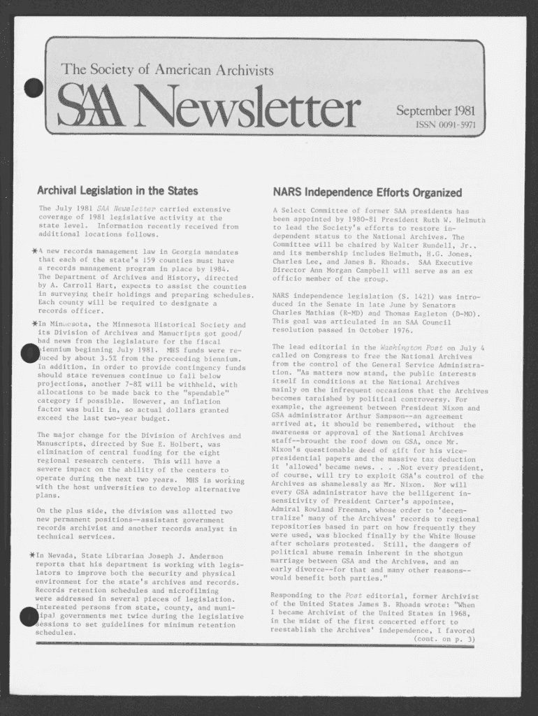 ISSN 00915971Archival Legislation in the Statesman Independence Efforts Organized July 1981 SAA Newsletter carried extensive