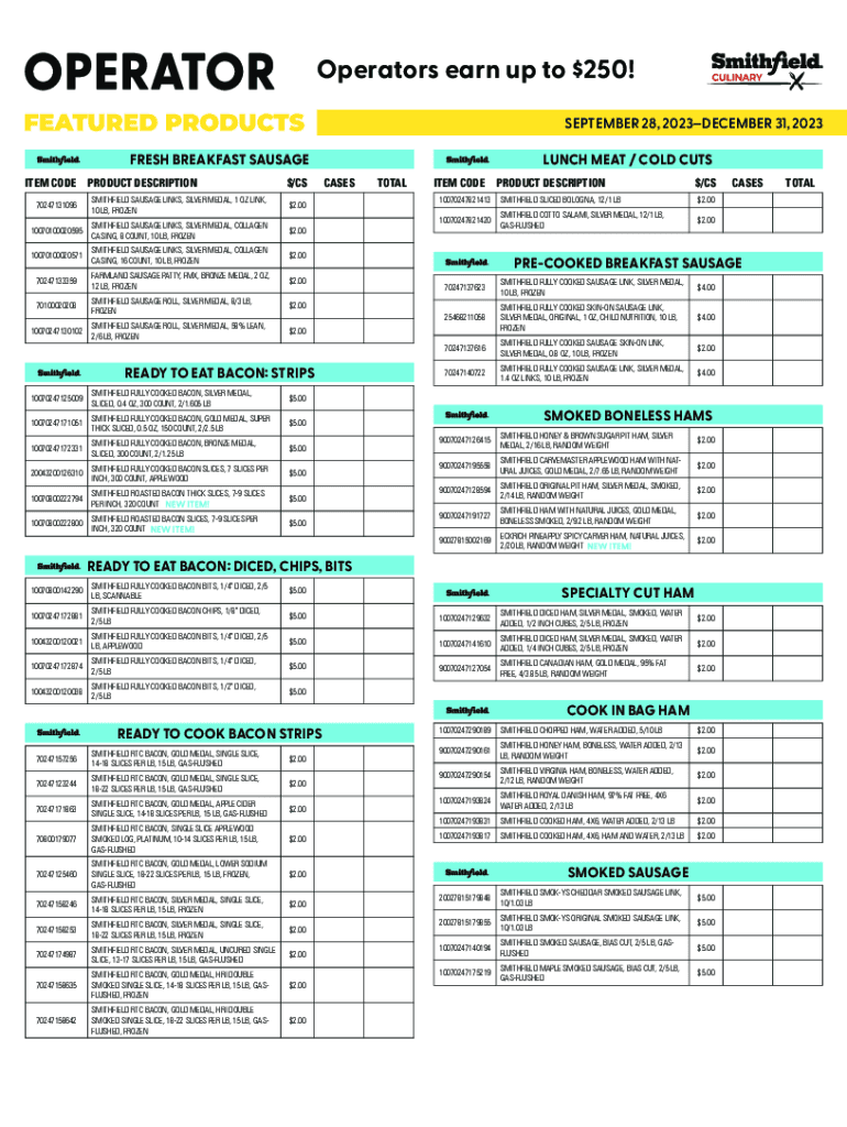 Operators earn up to $250! MAY 31AUGUST 29, SEPTEMBER 28, 2023DECEMBER 31,2021 2023 LUNCH MEAT / COLD CUTSFRESH BREAKFAST SAUSAGE ITEM CODEPRODUCT DESCRIPTION$/CS70247131096SMITHFIELD SAUSAGE LINKS,