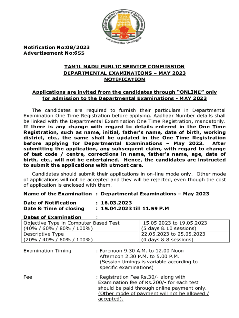 Notification No:08/2023 Advertisement No:655 TAMIL NADU PUBLIC SERVICE COMMISSION DEPARTMENTAL EXAMINATIONS MAY 2023 NOTIFICATION Applications are invited from the candidates through ONLINE only for