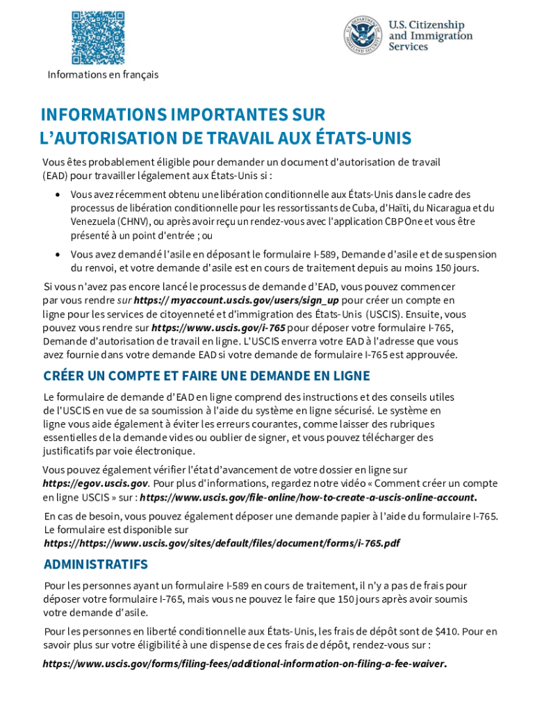 Informations en franaisINFORMATIONS IMPORTANTES SUR LAUTORISATION DE TRAVAIL AUX TATSUNIS Vous tes probablement ligible pour demander un document d\'autorisation de travail (EAD) pour travailler lgalement
