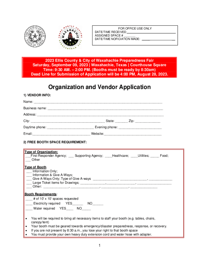 FOR OFFICE USE ONLY DATE/TIME RECEIVED ASSIGNED SPACE # ___ DATE/TIME NOFICIATION MADE: _____2023 Ellis County & City of Waxahachie Preparedness Fair Saturday, September 09, 2023 | Waxahachie, Texas