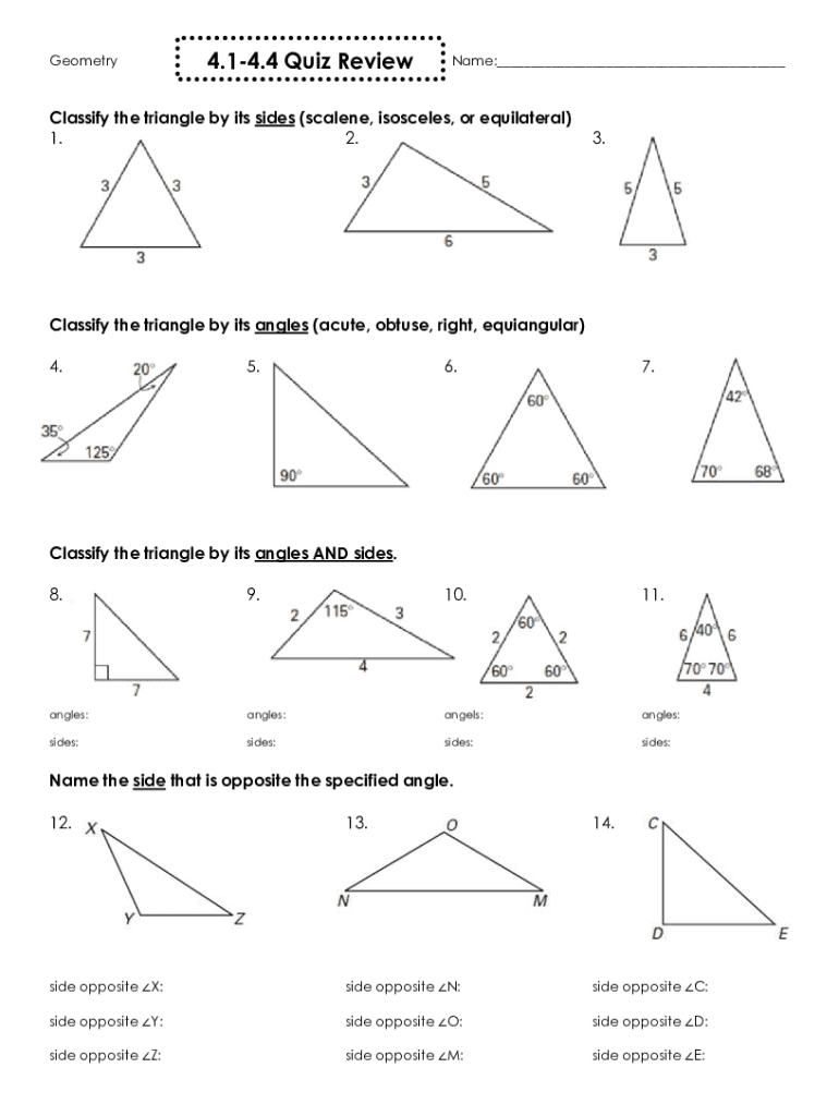 Geometry4.14.4 Quiz ReviewName:___Classify the triangle by its sides (scalene, isosceles, or equilateral) 1. 2.3.Classify the triangle by its angles (acute, obtuse, right, equiangular) 4.5.6.7.Classify