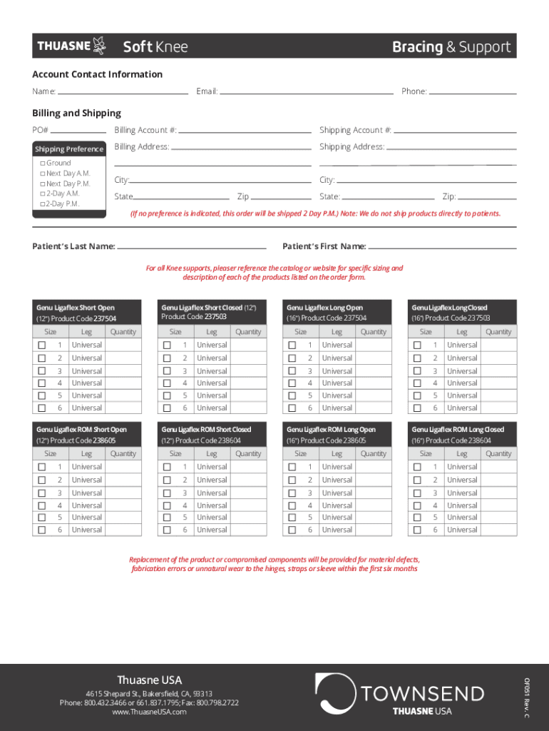 Soft KneeBracing & SupportAccount Contact Information Name:Email:Phone:Billing and Shipping PO# Shipping Preference Ground Next Day A.M. Next Day P.M. 2Day A.M. 2Day P.M.Billing Account #:Shipping