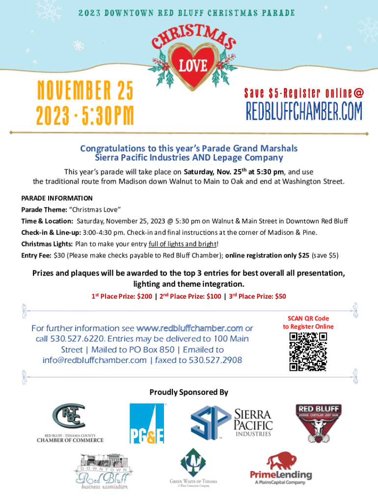 NOVEMBER 25 2023 5:30PMSave $5Register online@Congratulations to this years Parade Grand Marshals Sierra Pacific Industries AND Lepage Company This years parade will take place on Saturday, Nov. 25th
