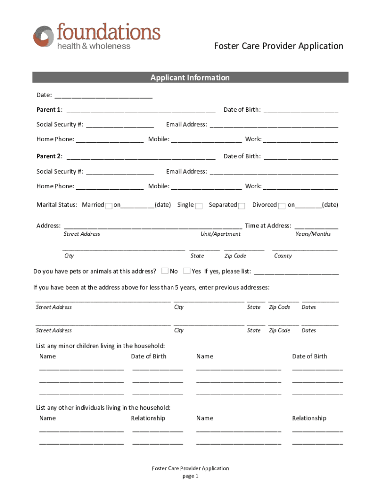 Foster Care Provider Application Applicant Information Date: ___ Parent 1: ___ Social Security #: ___Date of Birth: ___Email Address: ___Home Phone: ___ Mobile: ___ Work: ___ Parent 2: ___ Social
