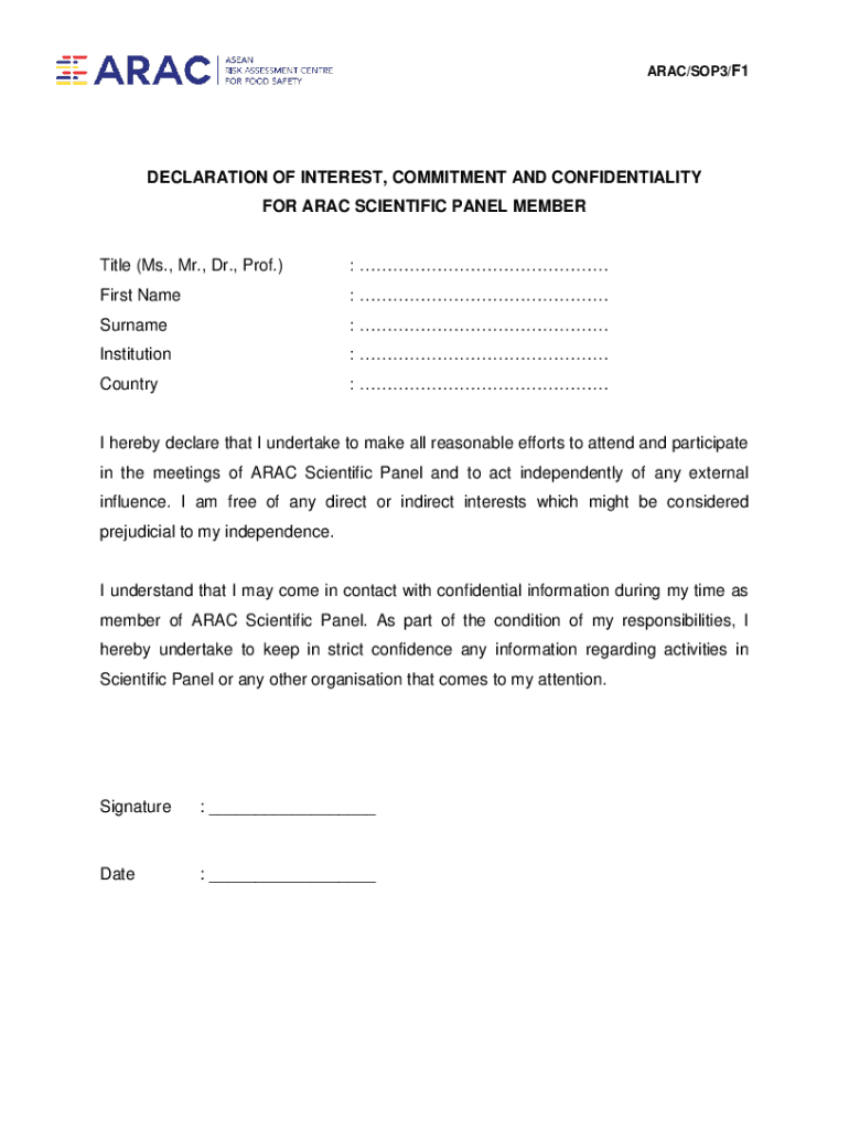 ARAC/SOP3/F1DECLARATION OF INTEREST, COMMITMENT AND CONFIDENTIALITY FOR ARAC SCIENTIFIC PANEL MEMBERTitle (Ms., Mr., Dr., Prof.): First Name: Surname: Institution: Country: I hereby declare that I