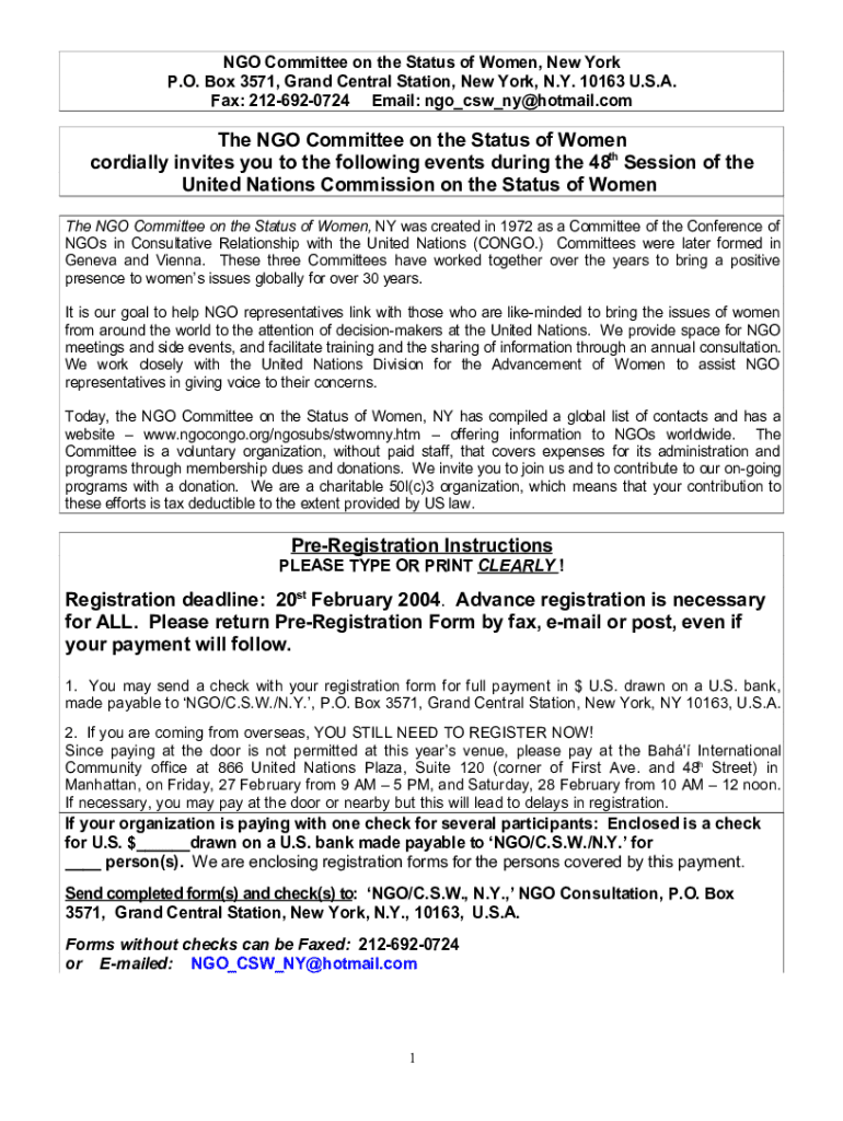 Fax: 2126920724 Email: ngo_csw_ny@hotmail.comThe NGO Committee on the Status of Women