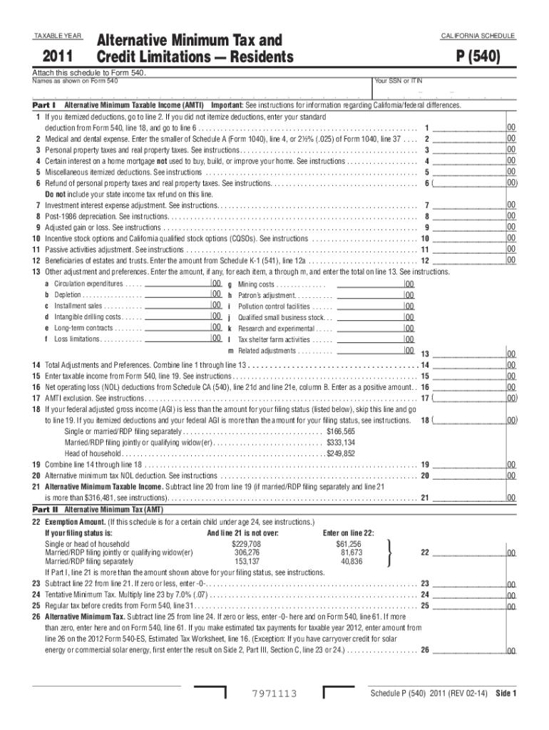 TAXABLE YEAR2011Alternative Minimum Tax and Credit Limitations ResidentsCALIFORNIA SCHEDULEP (540)Attach this schedule to Form 540. Names as shown on Form 540Your SSN or ITINPart IAlternative Minimum