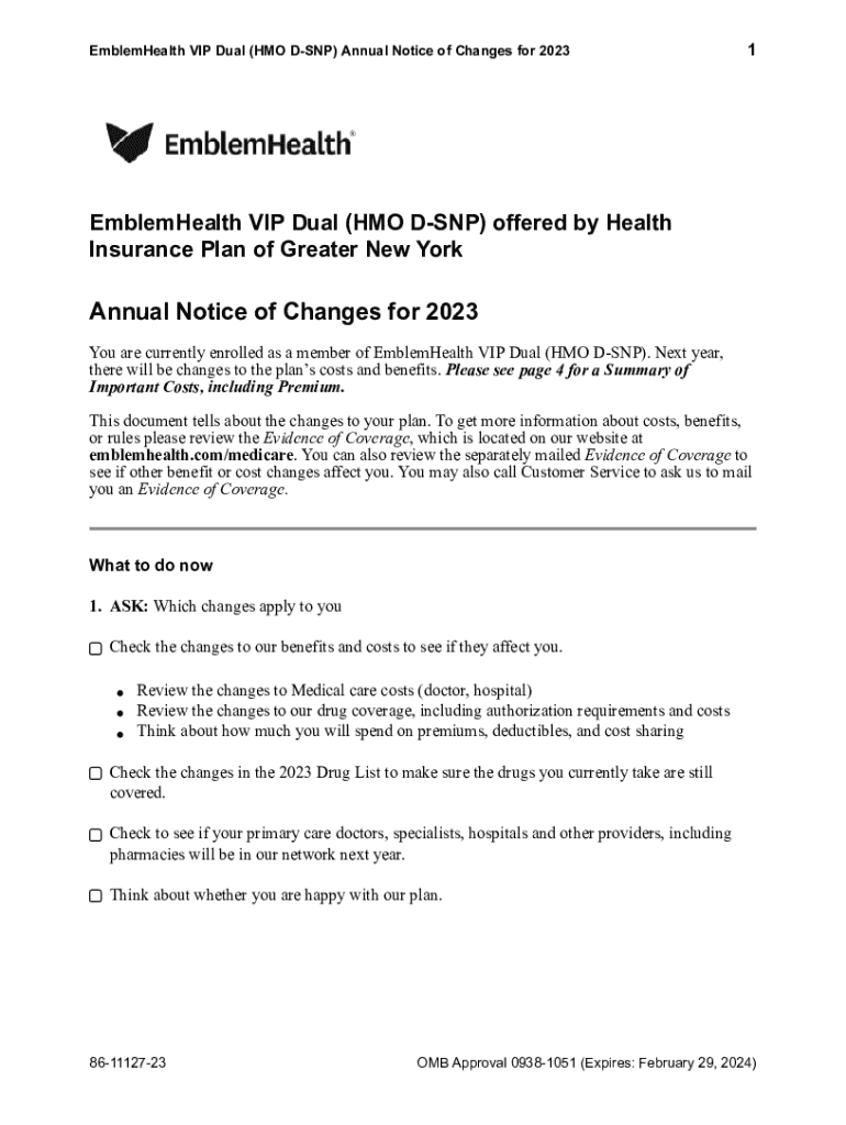 EmblemHealth VIP Dual (HMO DSNP) Annual Notice of Changes for 20231EmblemHealth VIP Dual (HMO DSNP) offered by Health Insurance Plan of Greater New YorkAnnual Notice of Changes for 2023 You are currently