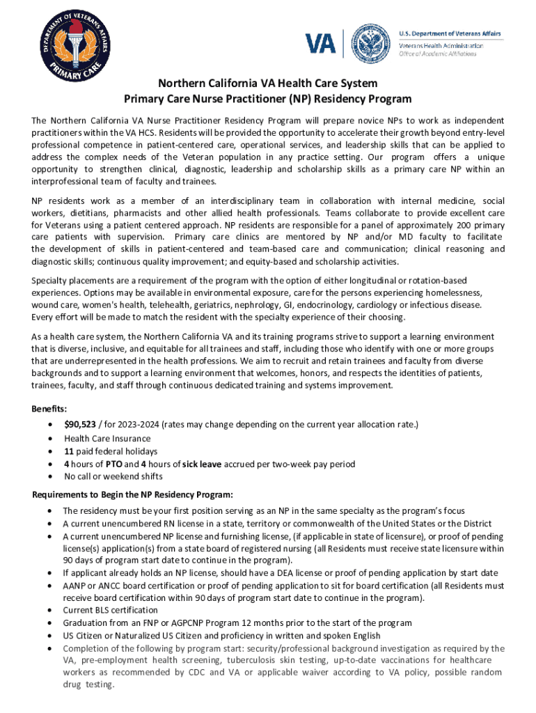 Northern California VA Health Care System Primary Care Nurse Practitioner (NP) Residency Program The Northern California VA Nurse Practitioner Residency Program will prepare novice NPs to work as