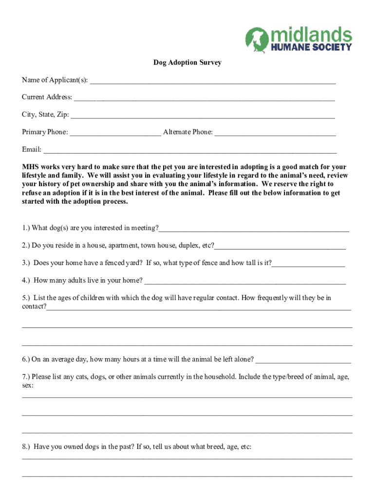 Dog Adoption Survey Name of Applicant(s): ___ Current Address: ___ City, State, Zip: ___ Primary Phone: ___ Alternate Phone: ___ Email: ___ MHS works very hard to make sure that the pet you are interested