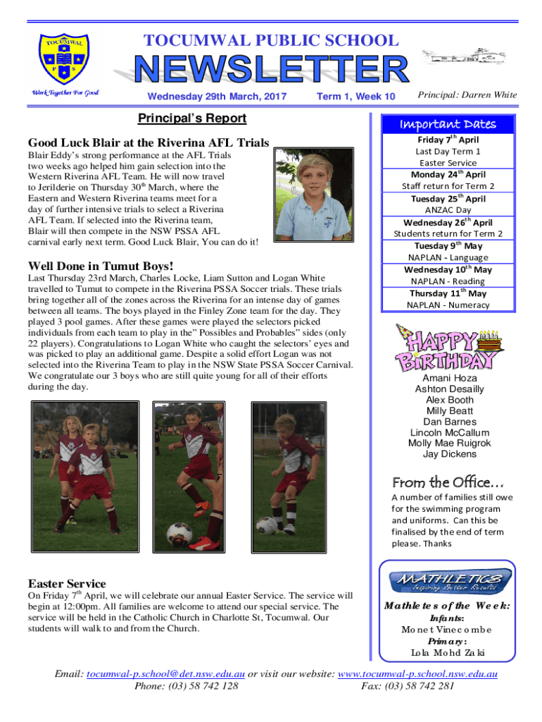 TOCUMWAL PUBLIC SCHOOLWednesday 29th March, 2017Term 1, Week 10Principals Report Good Luck Blair at the Riverina AFL Trials Blair Eddys strong performance at the AFL Trials two weeks ago helped him