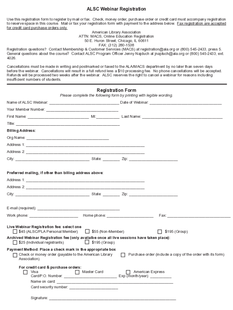 Use this registration form to register by mail or fax. Check, money order, purchase order or credit card must accompany registration