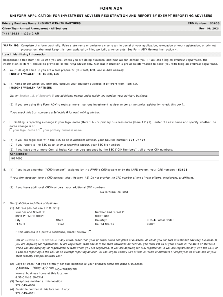 FORM ADV UNIFORM APPLICATION FOR INVESTMENT ADVISER REGISTRATION AND REPORT BY EXEMPT REPORTING ADVISERS Primary Business Name: INSIGHT WEALTH PARTNERSCRD Number: 153635OtherThanAnnual Amendment All