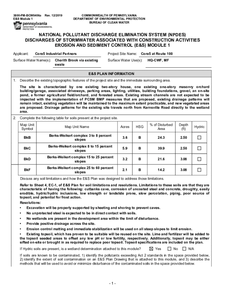 3800PMBCW0406a E&S Module 1Rev. 12/2019COMMONWEALTH OF PENNSYLVANIA DEPARTMENT OF ENVIRONMENTAL PROTECTION BUREAU OF CLEAN WATERNATIONAL POLLUTANT DISCHARGE ELIMINATION SYSTEM (NPDES) DISCHARGES OF