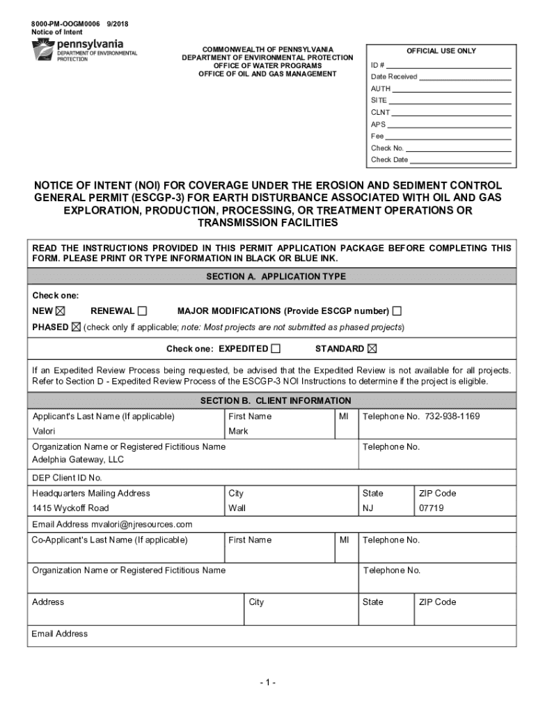 8000PMOOGM0006 Notice of Intent9/2018COMMONWEALTH OF PENNSYLVANIA DEPARTMENT OF ENVIRONMENTAL PROTECTION OFFICE OF WATER PROGRAMS OFFICE OF OIL AND GAS MANAGEMENTOFFICIAL USE ONLY ID # Date Received