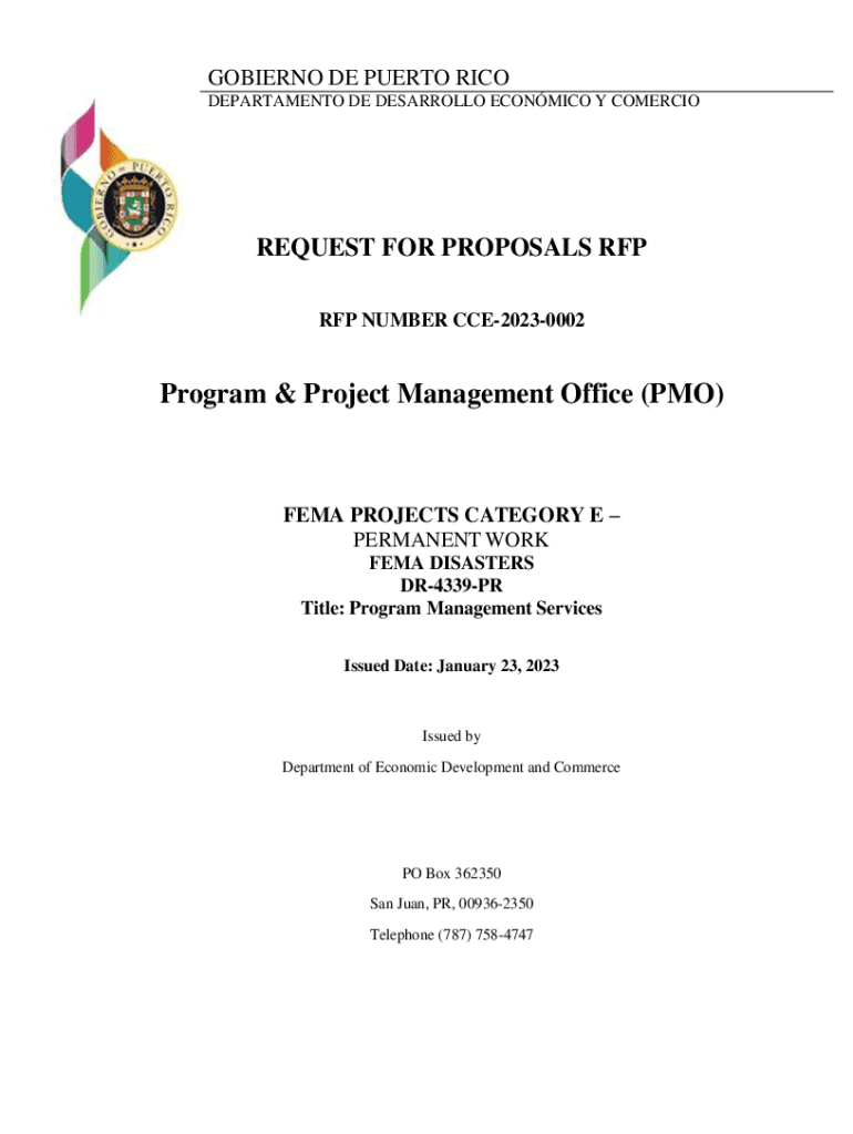 GOBIERNO DE PUERTO RICO DEPARTAMENTO DE DESARROLLO ECONMICO Y COMERCIOREQUEST FOR PROPOSALS RFP RFP NUMBER CCE20230002Program & Project Management Office (PMO)FEMA PROJECTS CATEGORY E PERMANENT WORK