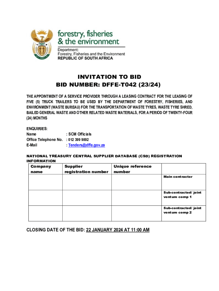 INVITATION TO BID BID NUMBER: DFFET042 (23/24) THE APPOINTMENT OF A SERVICE PROVIDER THROUGH A LEASING CONTRACT FOR THE LEASING OF FIVE (5) TRUCK TRAILERS TO BE USED BY THE DEPARTMENT OF FORESTRY,