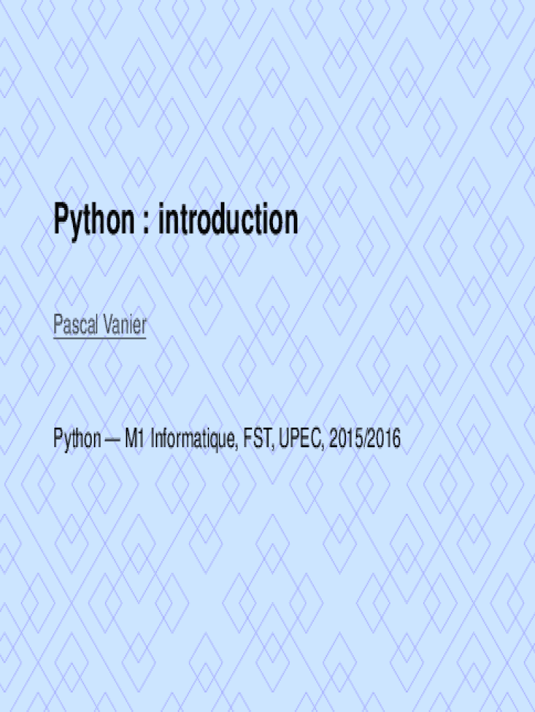 Python : introduction Pascal VanierPython M1 Informatique, FST, UPEC, 2015/2016printetformatprint permet dafficher des chaines lcran : 1print(\"toto \", 15)Quand le type nest pas str , print convertit
