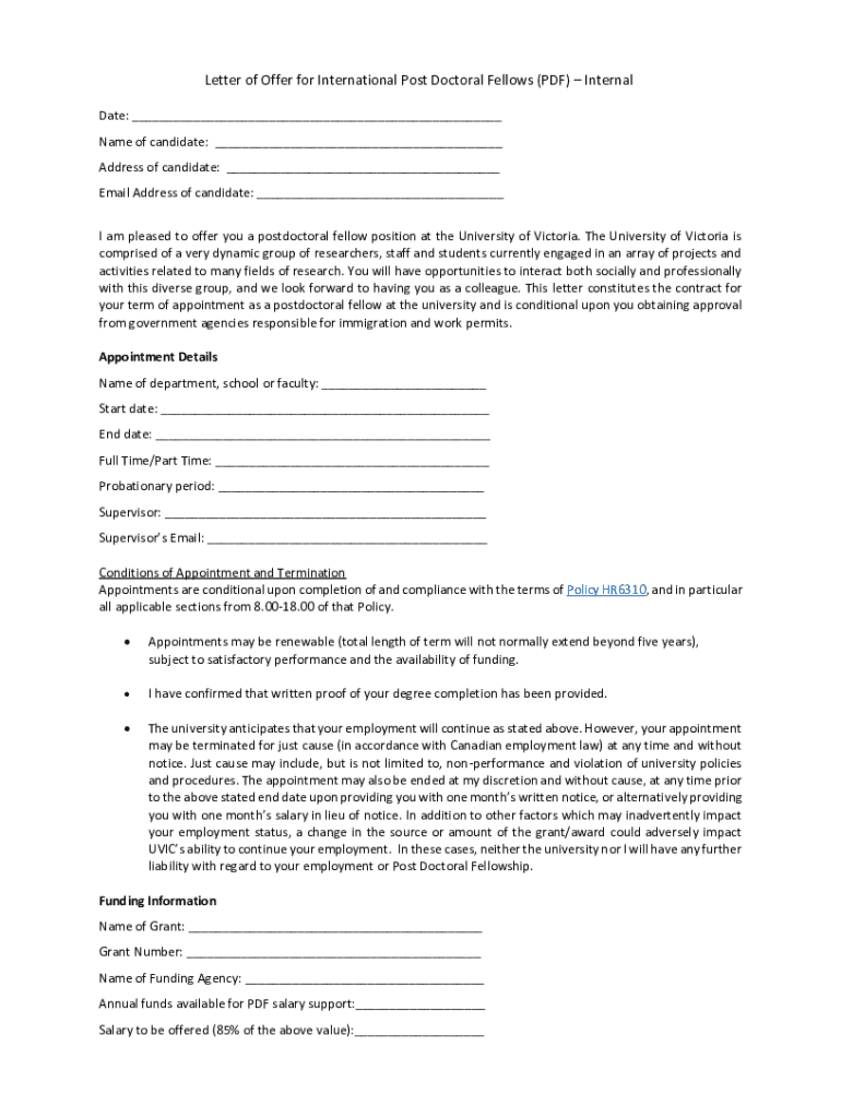 Get the free Letter of Offer for International Post Doctoral Fellows (PDF)