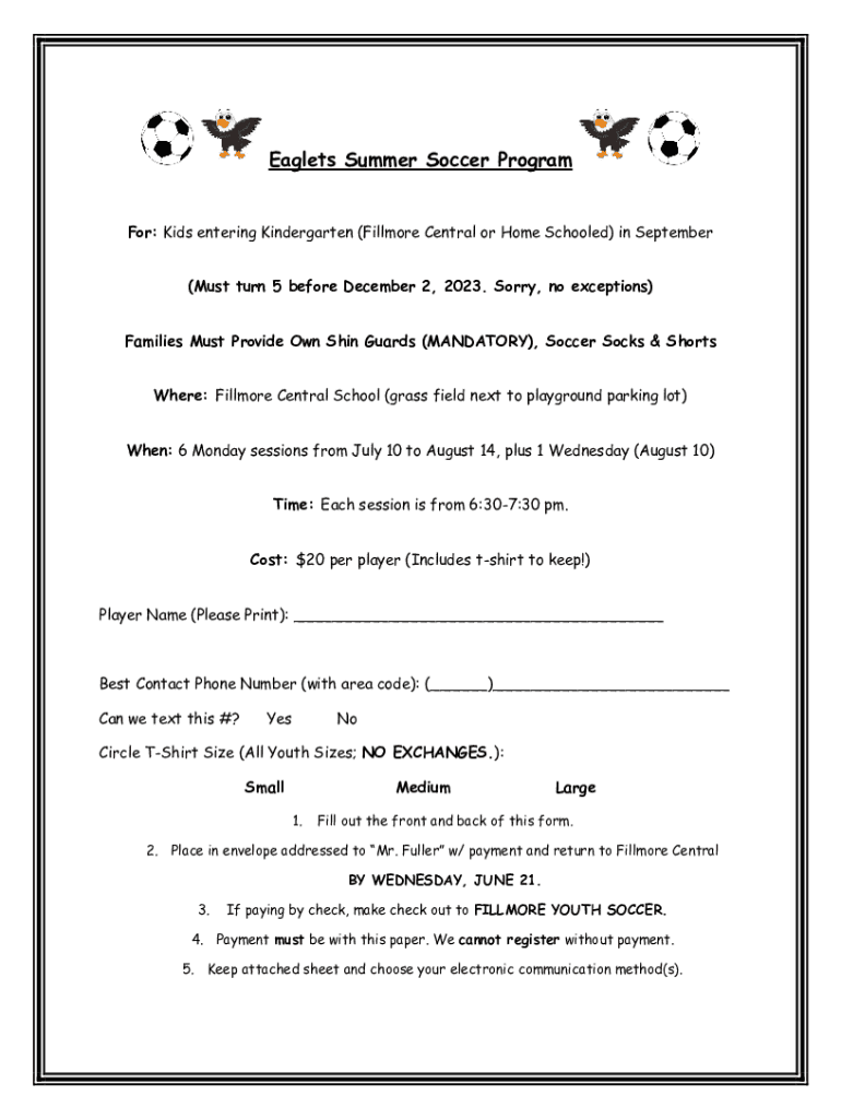 Eaglets Summer Soccer Program For: Kids entering Kindergarten (Fillmore Central or Home Schooled) in September (Must turn 5 before December 2, 2023. Sorry, no exceptions) Families Must Provide Own