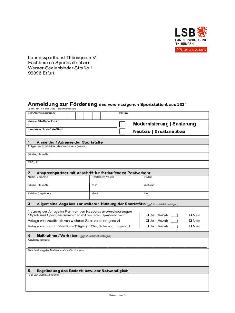 Landessportbund Thringen e.V. Fachbereich Sportstttenbau WernerSeelenbinderStrae 1 99096 ErfurtAnmeldung zur Frderung des vereinseigenen Sportstttenbaus 2021 (gem. Nr. 7.1 der LSBFrderrichtlinie*)DatumLSBVereinsnummer
