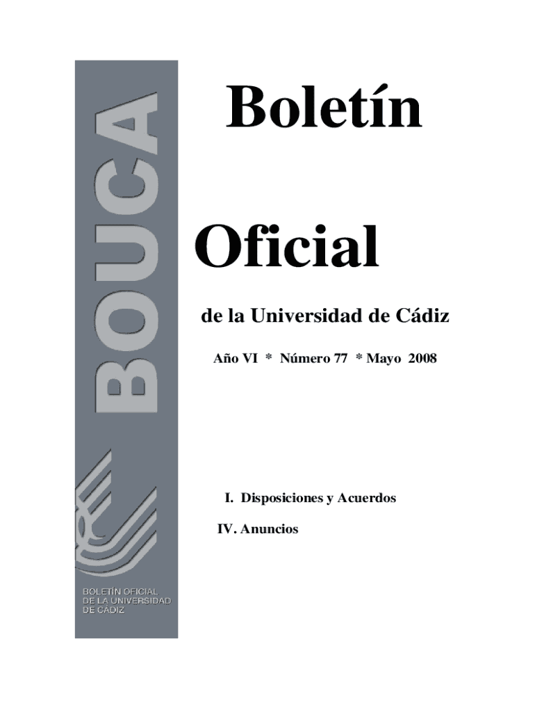 Boletn Oficial de la Universidad de Cdiz Ao VI * Nmero 77 * Mayo 2008I. Disposiciones y Acuerdos IV. AnunciosPg. 2Jueves 22 Mayo 2008BOUCA N 77SUMARIOI. DISPOSICIONES Y ACUERDOS DE LOS RGANOS DE GOBIERNO