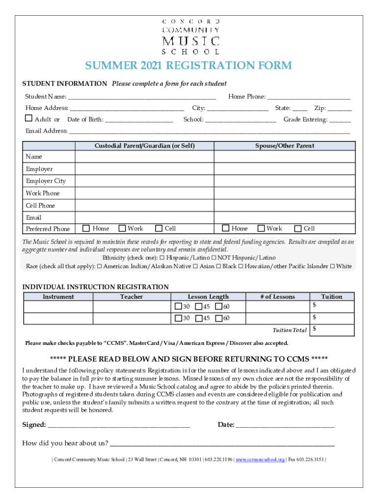 SUMMER 2021 REGISTRATION FORM STUDENT INFORMATION Please complete a form for each student Student Name: ___ Home Address: ___ Adult orDate of Birth: ___Home Phone: ___City: ___State: ___School: ___Zip: