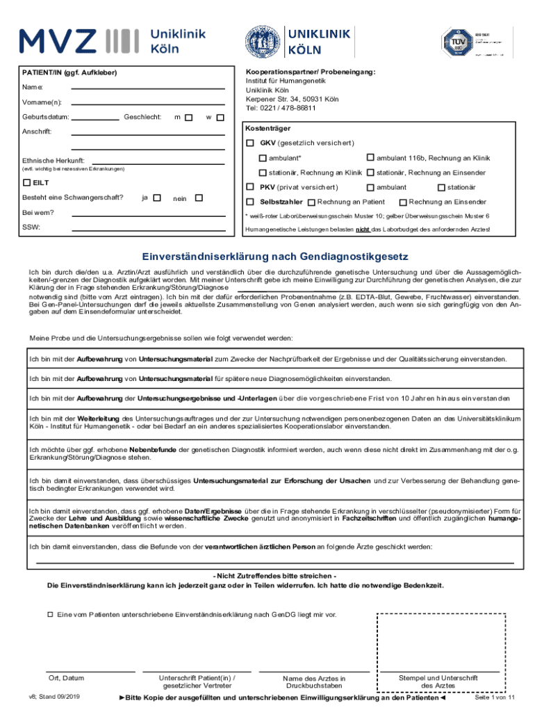 Kooperationspartner/ Probeneingang: Institut fr Humangenetik Uniklinik Kln Kerpener Str. 34, 50931 Kln Tel: 0221 / 47886811PATIENT/IN (ggf. Aufkleber) Name: Vorname(n): Geburtsdatum:Geschlecht:mw