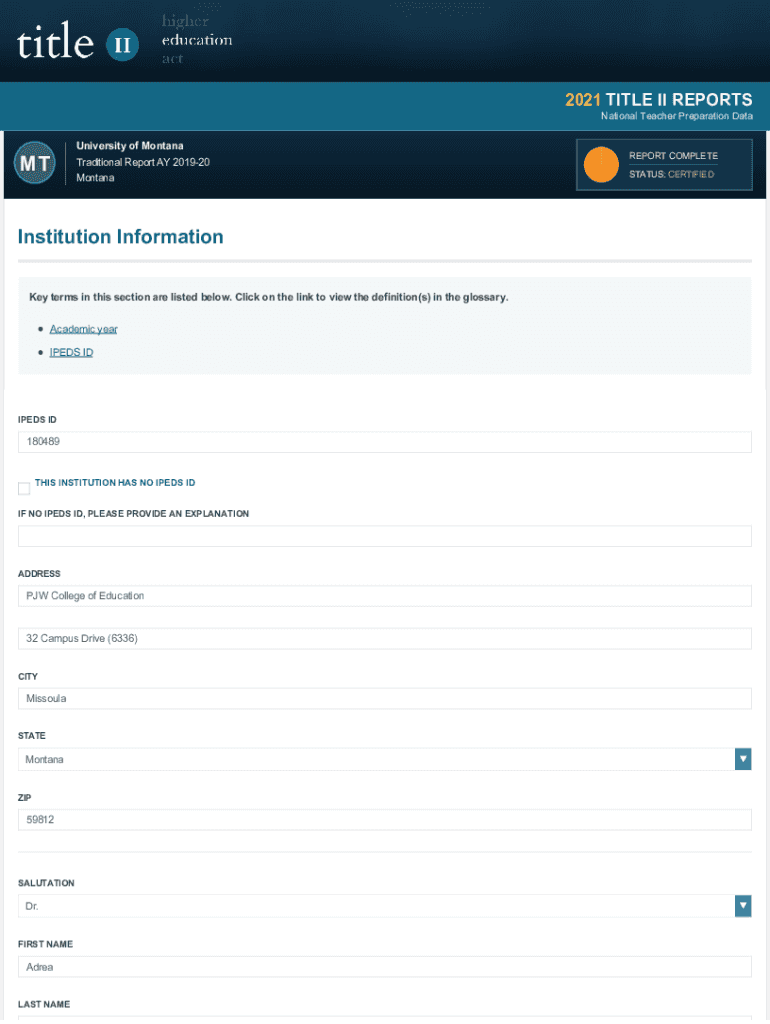 2021TITLEIIREPORTS NationalTeacherPreparationDataUniversityofMontana TraditionalReportAY201920 MontanaMTREPORTCOMPLETE STATUS:CERTIFIEDInstitutionInformation Keytermsinthissectionarelistedbelow.Clickonthelinktoviewthedefinition(s)intheglossary.