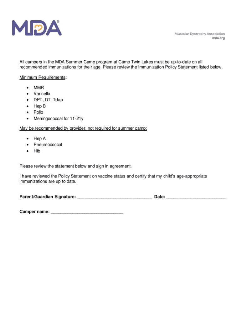 All campers in the MDA Summer Camp program at Camp Twin Lakes must be uptodate on all recommended immunizations for their age. Please review the Immunization Policy Statement listed below. Minimum