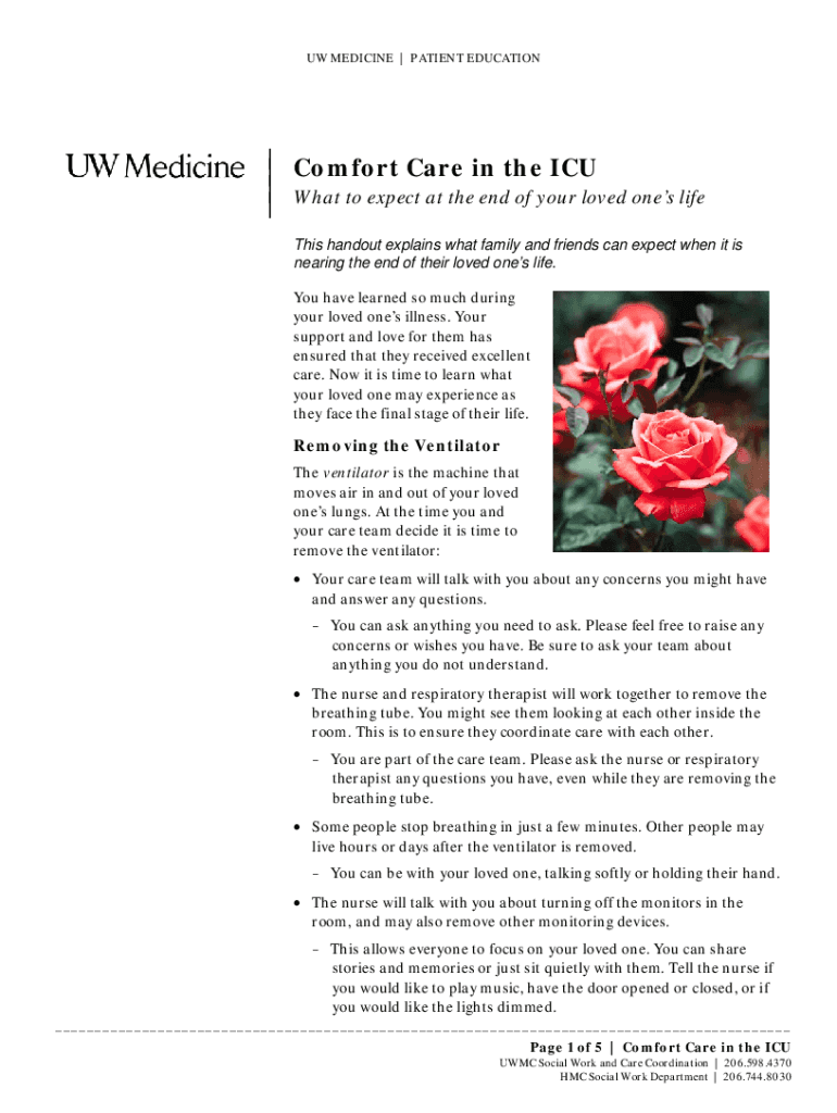 UW MEDICINE | PATIENT EDUCATION|| ||Comfort Care in the ICU What to expect at the end of your loved ones life This handout explains what family and friends can expect when it is nearing the end of