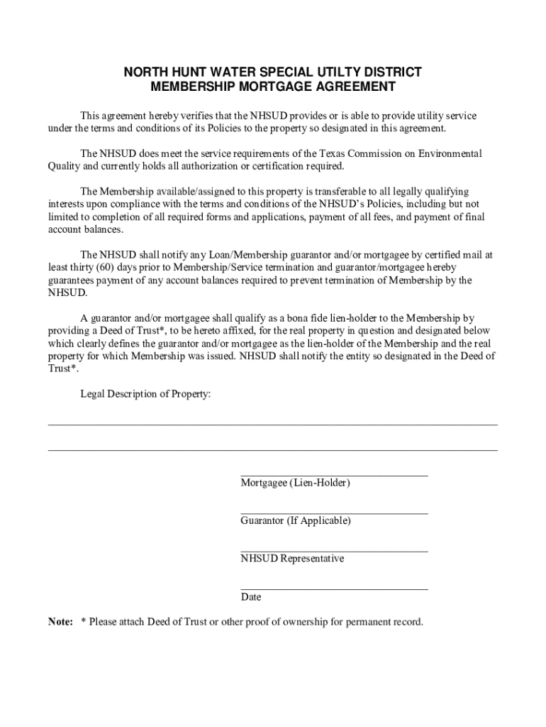 NORTH HUNT WATER SPECIAL UTILTY DISTRICT MEMBERSHIP MORTGAGE AGREEMENT This agreement hereby verifies that the NHSUD provides or is able to provide utility service under the terms and conditions of