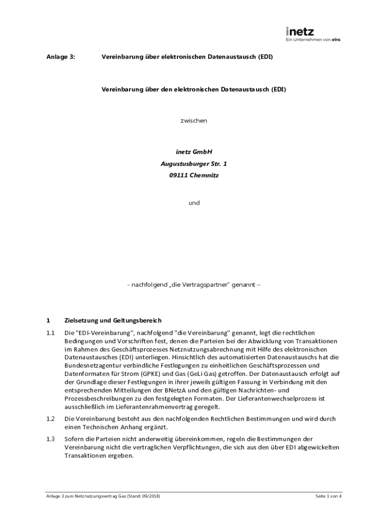 Anlage 3:Vereinbarung ber elektronischen Datenaustausch (EDI)Vereinbarung ber den elektronischen Datenaustausch (EDI)zwischeninetz GmbH Augustusburger Str. 1 09111 Chemnitzund nachfolgend die Vertragspartner