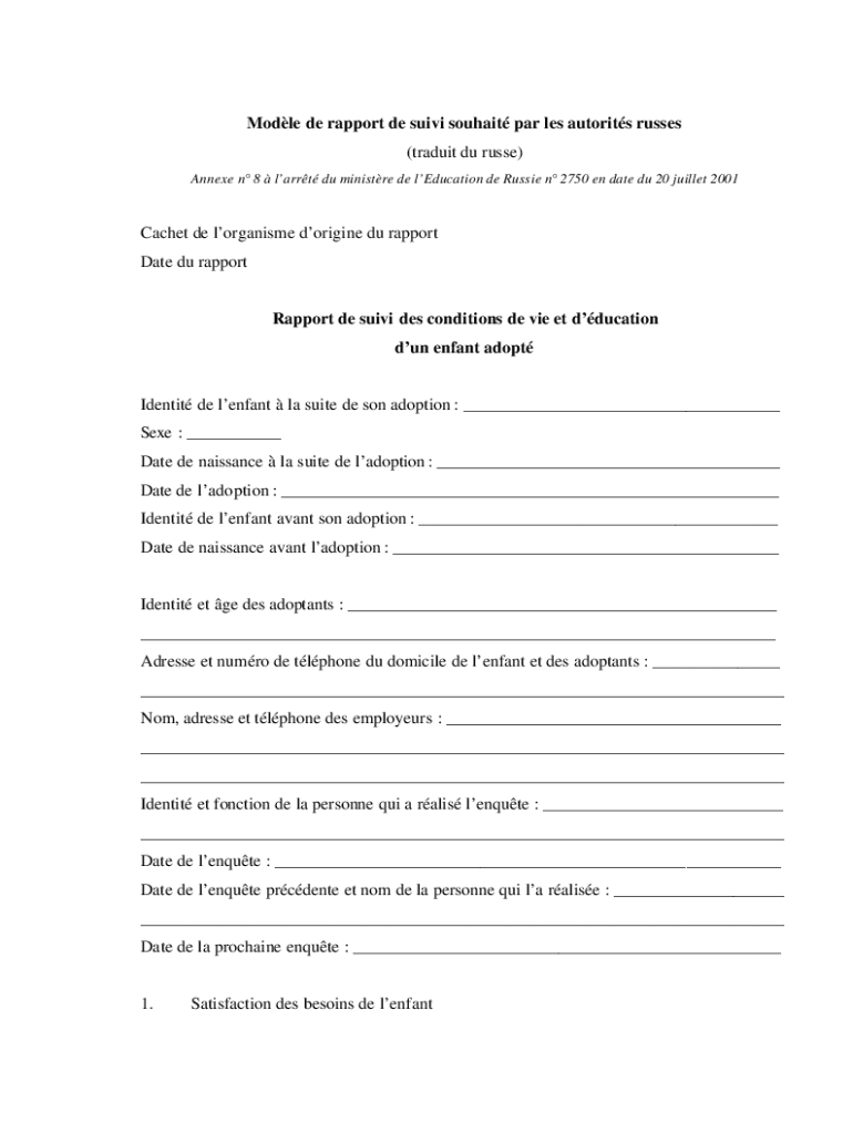 Modle de rapport de suivi souhait par les autorits russes (traduit du russe) Annexe n 8 larrt du ministre de lEducation de Russie n 2750 en date du 20 juillet 2001Cachet de lorganisme dorigine du