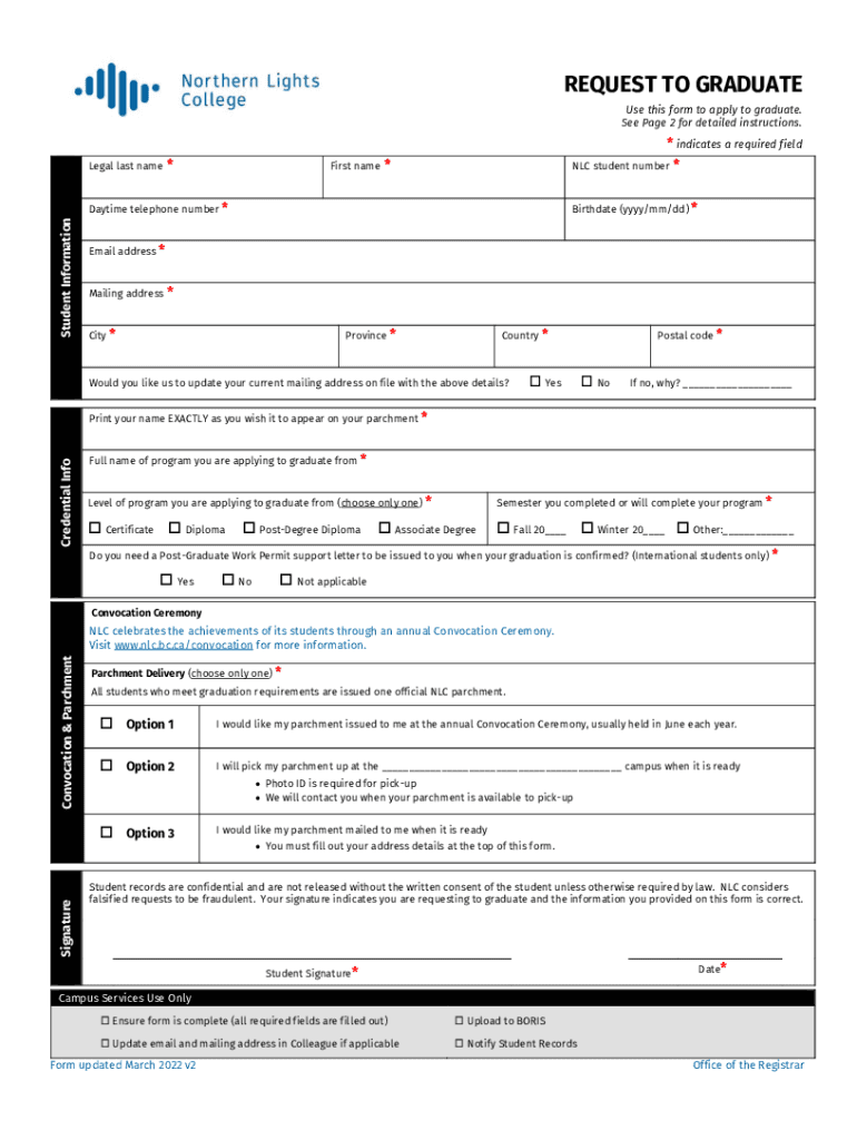 REQUEST TO GRADUATE Use this form to apply to graduate. See Page 2 for detailed instructions.* indicates a required field Legal last name*First name*NLC student numberStudent InformationDaytime telephone