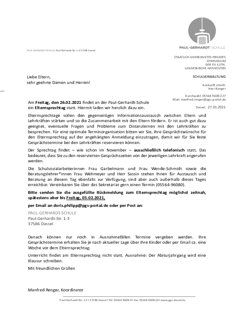 PAULGERHARDTSCHULE PaulGerhardtStr. 13 37586 DasselSTAATLICH ANERKANNTES PRIVATES GYMNASIUM DER EV.LUTH. LANDESKIRCHE HANNOVERSSCHULVERWALTUNGLiebe Eltern, sehr geehrte Damen und Herren!Am Freitag,