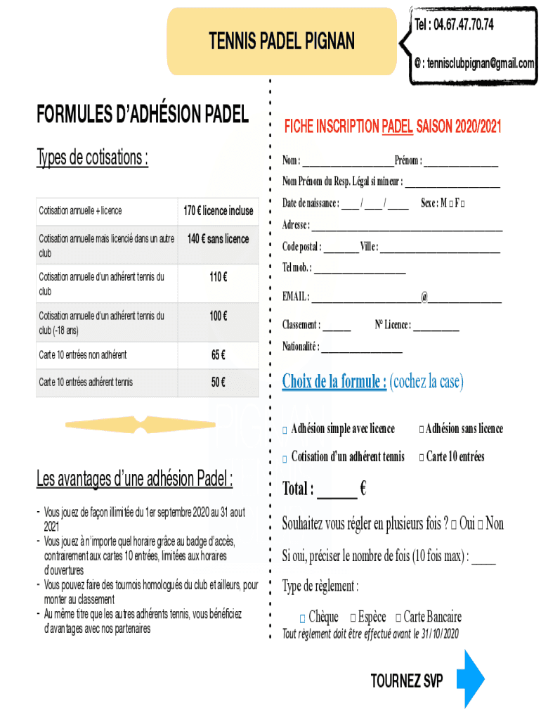 Tel : 04.67.47.70.74TENNIS PADEL PIGNANFORMULES DADHSION PADEL@ : tennisclubpignan@gmail.comTypes de cotisations :Cotisation annuelle + licence Cotisation annuelle mais licenci dans un autre clubFICHE
